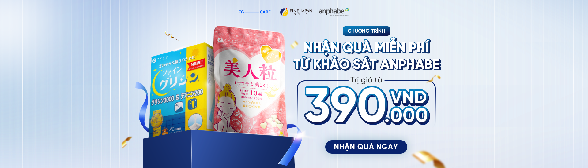 Khách hàng đã tham gia và hoàn thành khảo sát hợp lệ từ Anphabe được tặng ngẫu nhiên 1 trong 2 sản phẩm Viên uống trắng da Hatmomugi & Vitamin C hoặc Bột hỗ trợ ngủ ngon và sâu giấc Glycine & Theanine khi mua hàng với hóa đơn bất kỳ tại website Fine Japan.
